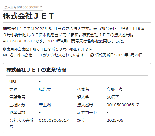 競艇ジェットの運営会社は特商表記上では、「競艇JET運営局」と掲載されていますが、いくつかの調査を行う段階でしっかり法人登録がされている会社だと判明したので以下に掲載しておきます。