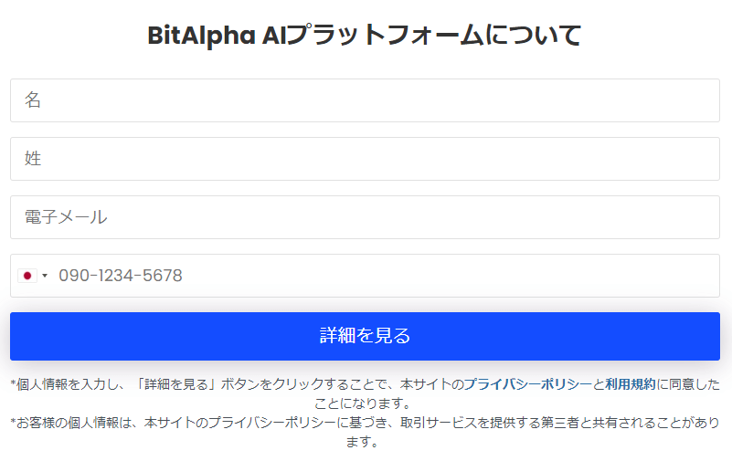 ちなみに、BitAlpha AI(ビットアルファAI)に登録を行うには以下の3点の入力が必要となります。