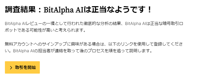 全体として、BitAlpha AI は、安全な検証プロセスと厳格なセキュリティ プロトコルを備えた、合法的で信頼できる暗号通貨取引プラットフォームであることが証明されています。 したがって、BitAlpha AI は確かに合法であると結論付けることができます。
