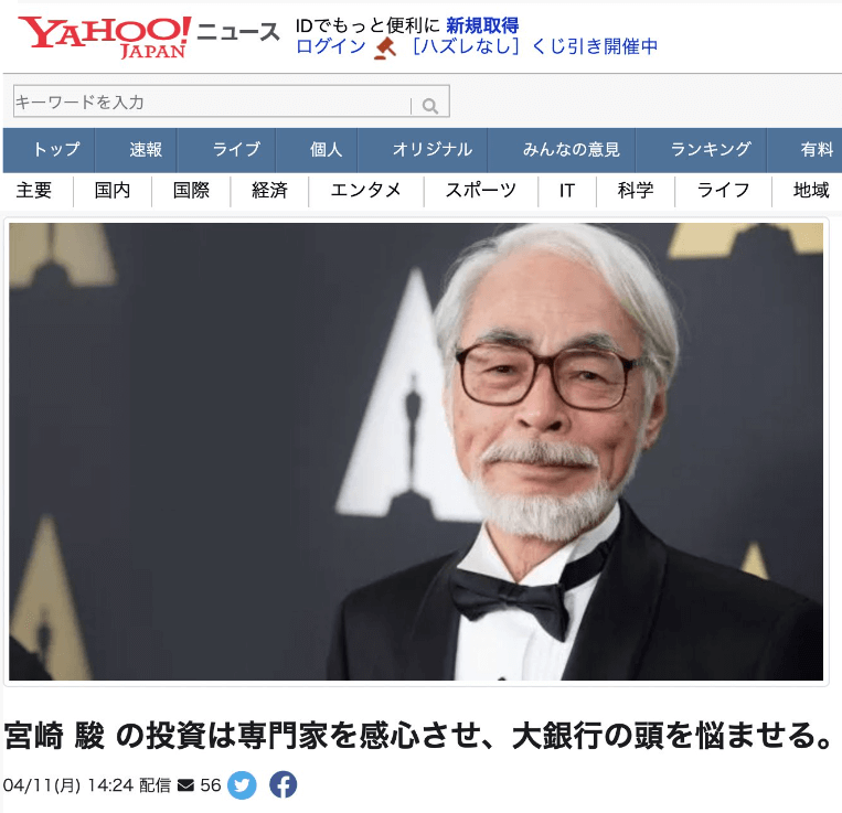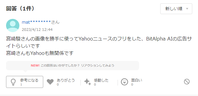 BitAlpha AI(ビットアルファAI)でも同じように、yahooニュースに似せた悪質サイトを作成し、ジブリアニメで有名な「宮崎駿」が新しい仮想通貨の取引プラットフォームの紹介をしているように見立てた記事を公開していました。