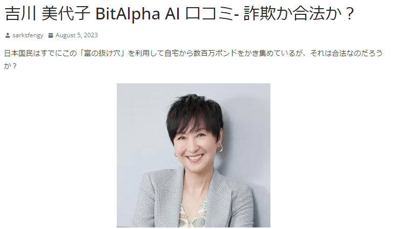 ※以下のフリーアナウンサー吉川美代子さんの記事に関しても、BitAlpha AI(ビットアルファAI)の運営者によるでっち上げ記事となります。(画像をクリックするとフェイク記事に飛びます)
