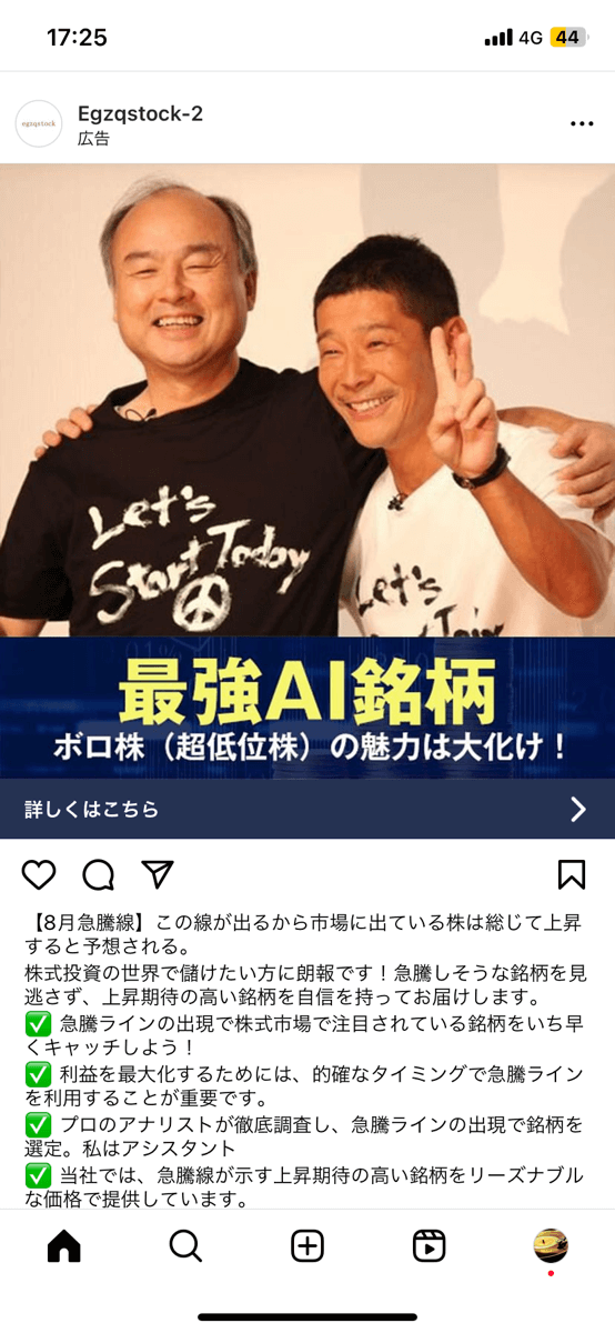 有名な方で例を挙げると、お金配りおじさんの前澤友作さんやオリエンタルラジオのあっちゃん、他のも相場の神様 藤本誠之さん、月曜から夜更かしで有名になった桐谷さん、ソフトバンクGの孫さん、ホリエモン等が悪用されていることが確認済みです。