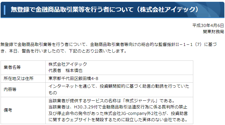 株式ジャーナルの運営会社である株式会社アイテックについてネットで調べてみたところ、平成30年4月6日に関東財務局により警告を受けている会社ということが分かりました。