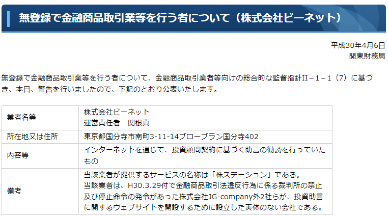 禁じ手投資術の運営元である株式会社ビーネットは、金融庁から許可を得ずに無登録の株情報サイトを運営していたことで過去に警告を受けた経歴がある会社です。